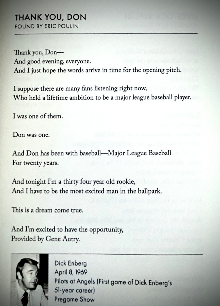 In the leadoff spot — for this presentation, and in the book — Poulin pulled up Dick Enberg’s first KMPC-AM (710) broadcast with the California Angels. What a polished gem. The Halos faced the brand-new Seattle Pilots on April 8, 1969 at the Big A. This was a broadcast also on Classic Baseball on the Radio (see below). And about nine minutes into the clip, Don Wells tees up the broadcast for a man who would launch into a five-decade career in this craft after working as a part-time baseball coach at San Fernando Valley State: