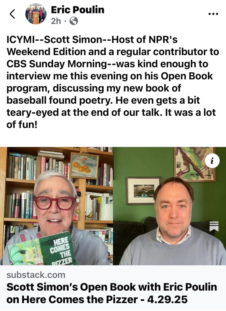 == The esteemed Scott Simon brought Eric Poulin on for a chat that was part of his Substack “Open Book” posting.
