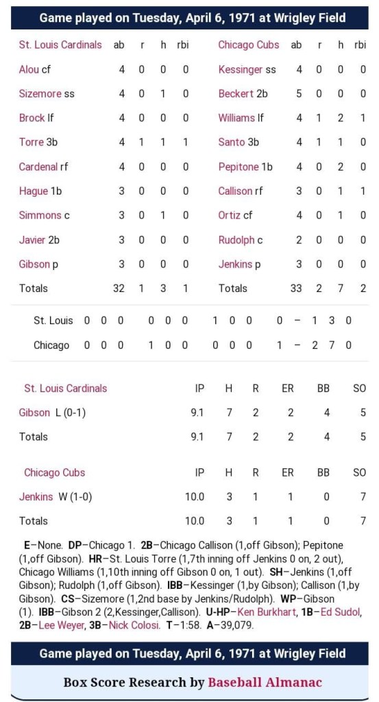 == One more tidbit on Williams: On Opening Day 1971 at Wrigley field, the Cubs’ Ferguson Jenkins faced the Cardinals’ Bob Gibson. The game was knotted at 1-1 after nine innings, and both were still pitching. Because of course they were. Williams ended it in the bottom of the 10th with a one-out homer. Fly the “W” flag. It took less than two hours.