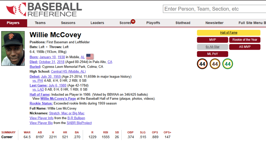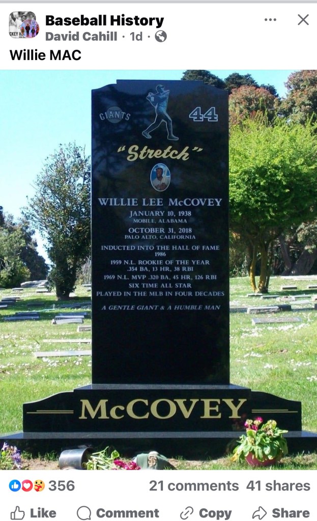 Willie Lee McCovey was a Hall of Fame inductee in 1986, his first year of eligibility. It says on his tombstone: “A gentle giant and a humble man.”