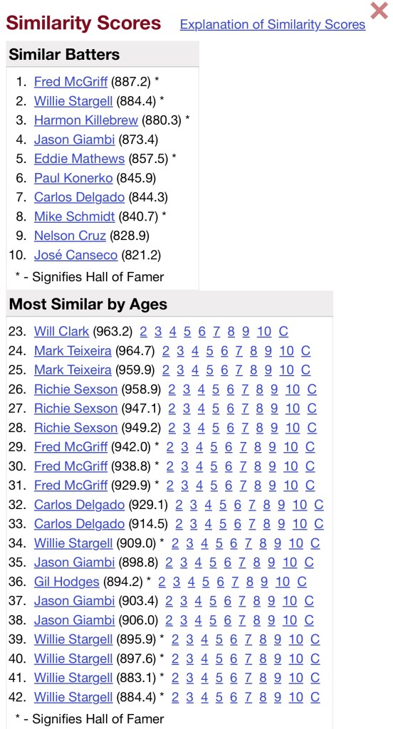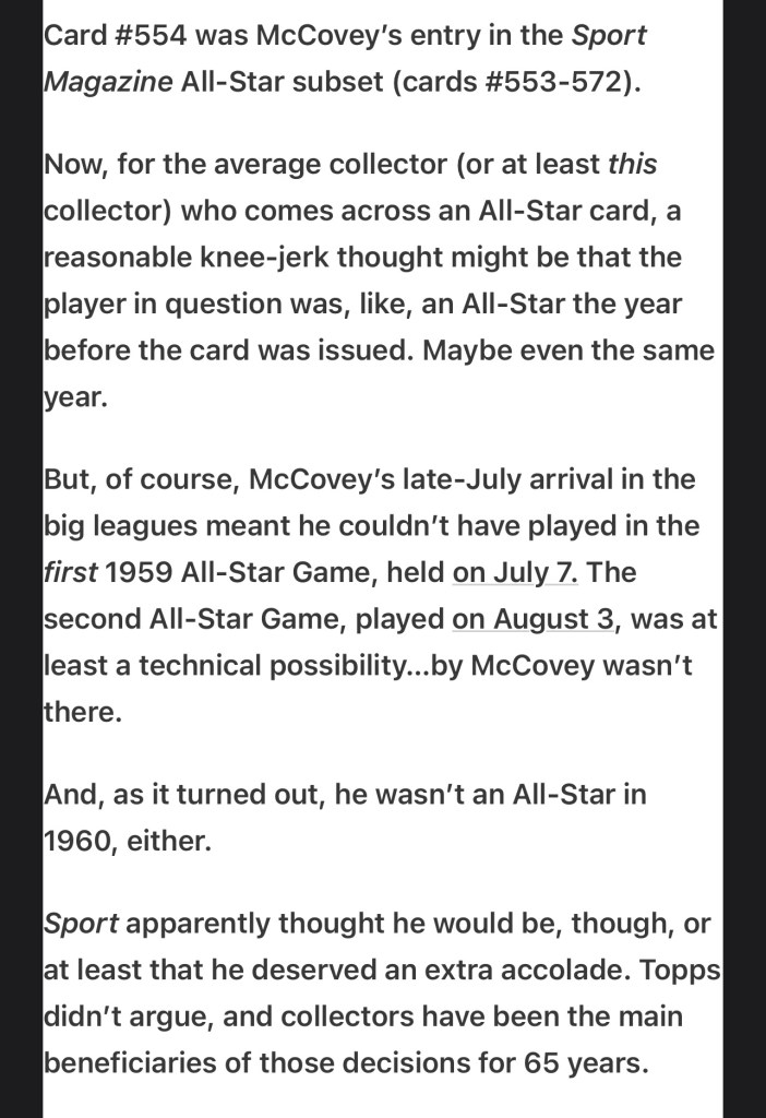 McCovey seemed to be more along the lines of Willie Stargell in stature and intimidation. It’s nice to see the data at one point even connected him to Gil Hodges. Bill James’ Hall of Fame monitor gives McCovey a 111 mark (with a likely Hall of Famer registering a 100). His 44.8 seven-year peak WAR exceeds the “average” Hall of Fame first baseman in that window (42.0).