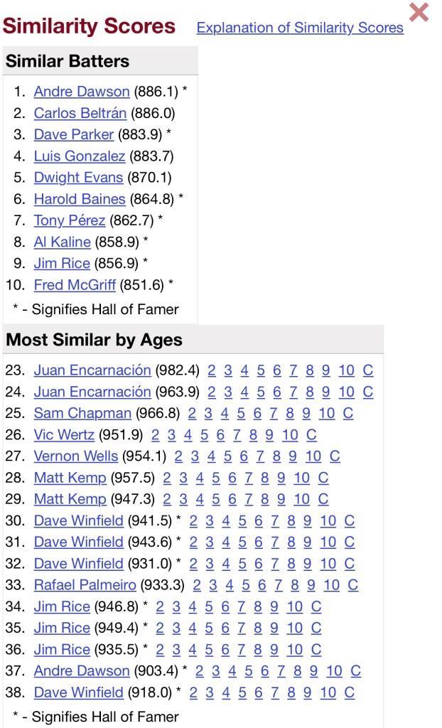 Williams most compares statistically, and from the eye test, to Hall of Famers like Andre Dawson, Dave Parker and Tony Perez. Dave Winfield and Fred McGriff are also in that mix. Bill James’ Hall of Fame monitor gives Williams a 122 mark (with a likely Hall of Famer registering a 100). His 41.3 seven-year peak WAR measures up to the “average” Hall of Fame left fielder in that window (41.7).