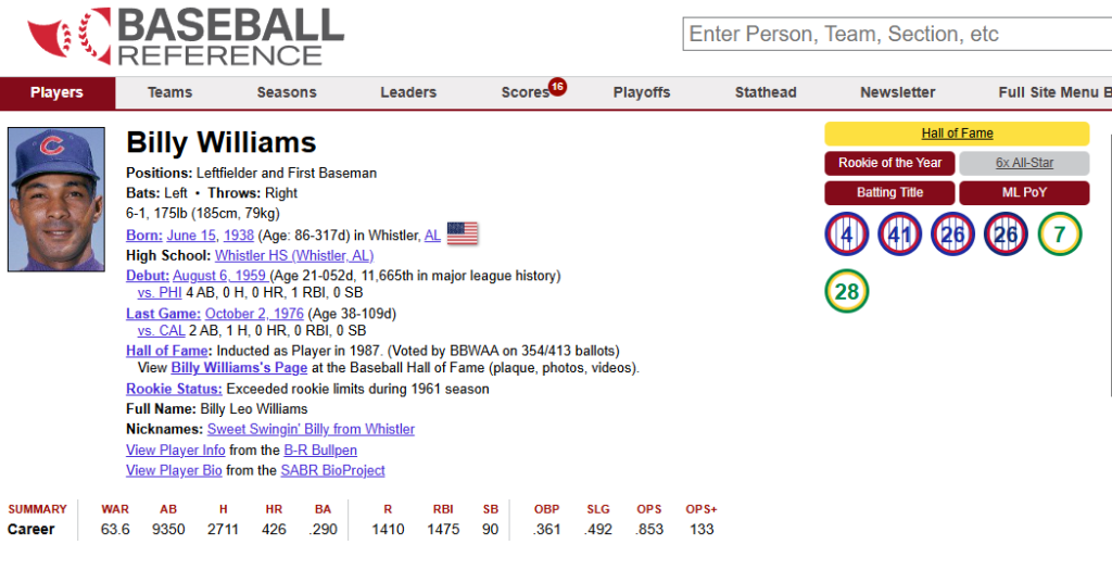 The 1961 NL Rookie of the Year at age 23 hit.278 in 146 games with 25 homers and 86 RBIs, and a 1.2 WAR that season (he was voted ahead of Milwaukee’s Joe Torre and his 3.4 WAR. Led the league in games played in ’65, 66, ’68, ’69 and ’70 while setting the NL record for consecutive games played at 1,117 through the end of the ’70 season (later broken by Steve Garvey).