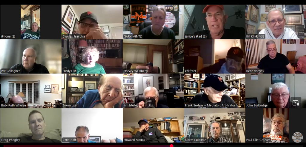 == In early February, Haft did a Zoom call with the swell group of guys at the New York Giants Preservation Society. The link is here. The screen save is above. Note the guy third row down from the top, two squares in from the left. “Zoom user.” He’s riveted.