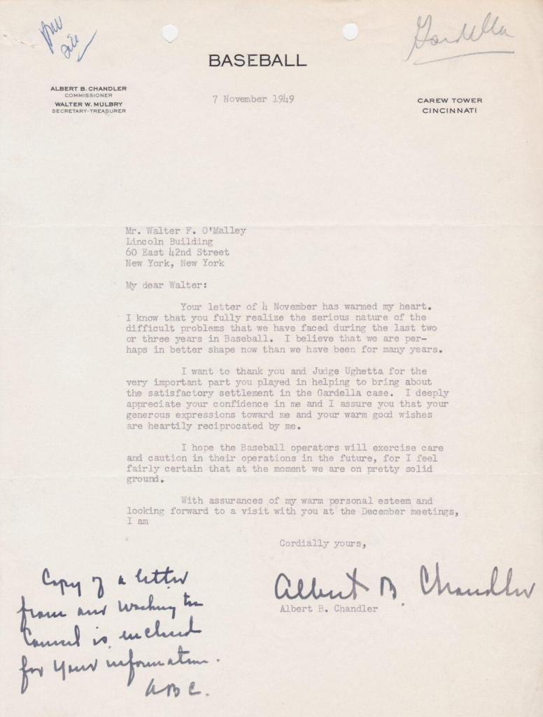 == A letter posted on CooperstownExpert.com where Gardella explains, in his own handwriting, why he went to Mexico to play, referring to Commissioner Happy Chandler as “cheap & monopolistic”:
