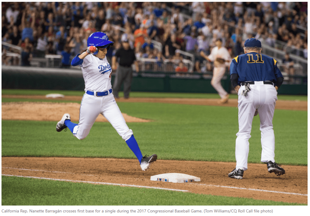 For the 2019 game, Barragán and good friend Linda Sanchez (CA-38) were the only two women players. Barragán invited the D.C. Girls Baseball Team as her special guest, taking pride int he fact her 44th District — Carson, Compton, Lynwood, North Long Beach, Rancho Dominguez, San Pedro, South Gate, Walnut Park, Watts, Willowbrook and Wilmington — includes the Compton Youth Baseball Academy, which hosts annual girls baseball tournaments.