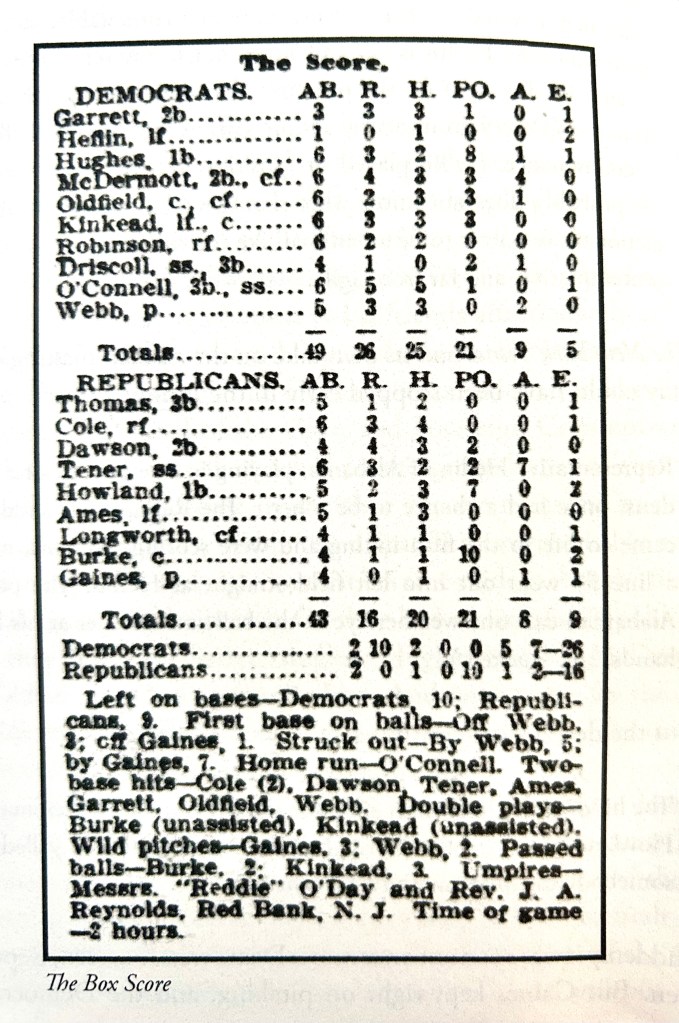 Tener was a 46-year-old Republican representing Pennsylvania’s 24th district in 1908 and gets plenty of ink in “The House Divided” as the prime fulcrum for the Congressional Baseball Game happening. As team captain and shortstop who hit cleanup, he went 3-for-6 in a 26-16 loss to the Dems, who were led by third-baseman/shortstop J.F. O’Connell (Mass-10). According to the box score, O’Connell went 5-for-6 with five runs and the game’s only homer as he hit in the No. 8 spot.