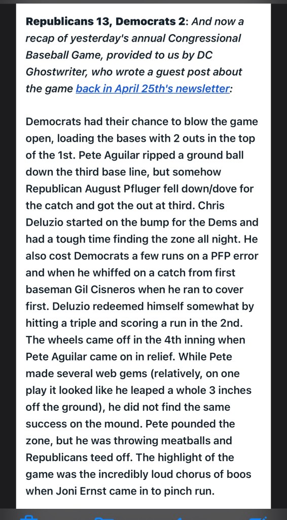 So if you’re scoring at home, or just sitting alone, the Republicans have won 46, including the last four, and last year by a 31-11 count. The Democrats have tallied 42 wins. Heading into the 2025 Congressional Baseball Game, we wish everyone good luck in having the official box score certified no matter the outcome.