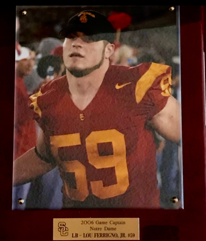 That didn’t really happen. He never played a down. Ferrigno’s time in the USC program, however, includes a time when Carroll allowed him to suit up and be one of the team captains before the Nov. 25 game against 10-1 Notre Dame at the Coliseum, which resulted in a 44-24 win.