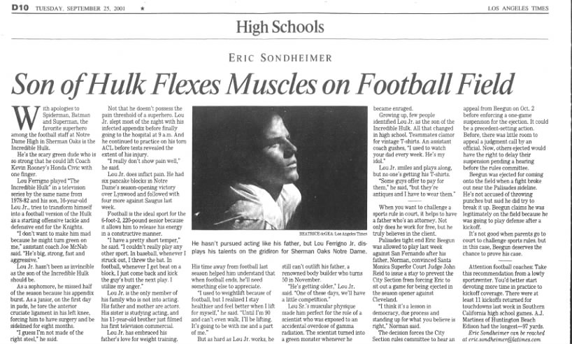 During his time at Notre Dame High, a story in the Los Angeles Times gave up any thoughts he could stay under the radar. “Lou Ferrigno played ‘The Incredible Hulk’ in a television series by the same name from 1978-82, and his son, 16-year-old Lou Jr., tries to transform himself into a football version of the Hulk as a starting offensive tackle and defensive end for the Knights,” the story read.