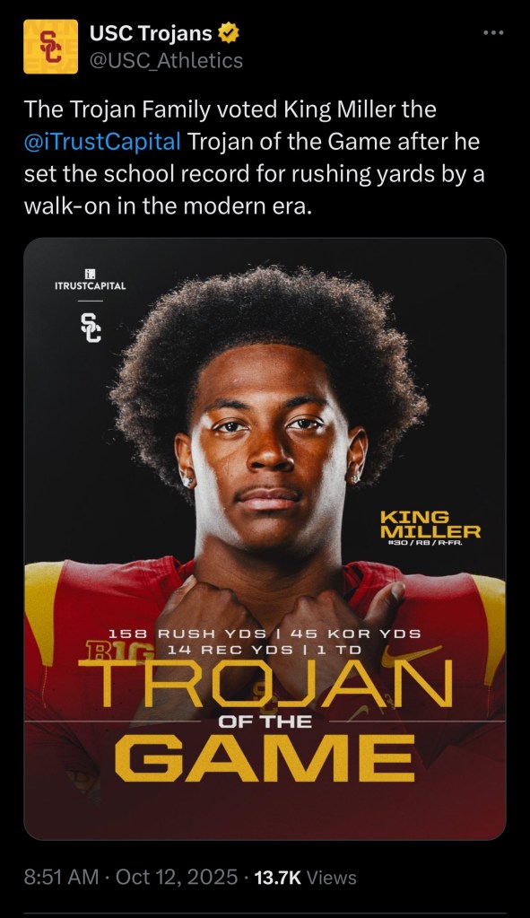 The 2025 USC football season saw running back King Miller (wearing No. 30) and twin brother Kaylon Miller (wearing No. 60) come from Calabasas High to work their way into the starting lineup. King Miller burst on the scene when he ran for 158 yards and a touchdown in 18 carries in a 31-13 win over No. 5 Michigan at the Coliseum in Week 7. He also had 217 all-purpose yards in the game with two receptions and two kickoff returns. That won him the Big Ten Freshman of the Week, Paul Hornung National Player of the Week and Burlsworth Trophy Walk-On of the Week. Kaylon Miller stepped in at right guard during a Week 9 win over Nebraska, posting an 88.2 pass block grade — third-best in the Big Ten. King Miller scored USC’s go-ahead touchdown on a 6-yard run in the fourth quarter, following Kaylon’s block to secure the Trojans’ 21-17 victory over the Cornhuskers in Lincoln, Neb.
