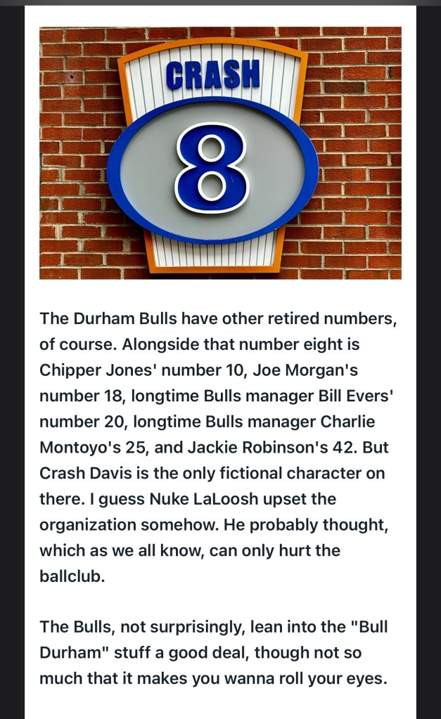 From then on, Sheen, as Vaughn, was a scene stealer. It helped that Bob Uecker unloaded his famous line, “JUST a bit outside,” from the broadcast booth when describing one of Vaughn’s wild pitches.