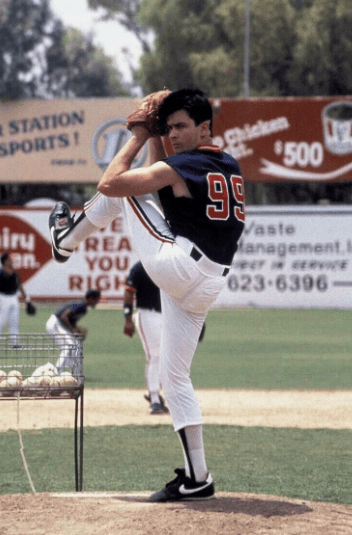 Charlie Sheen, as Ricky “Wild Thing” Vaughn, Cleveland Indians relief pitcher (1989) in the movie “Major League.”