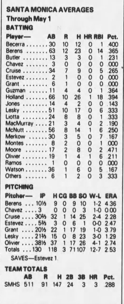 When the Vikings finished third in the Bay League in ’83, they might have used Estévez in the first round of CIF-Southern Section 4A Division playoff game against Hoover High of Glendale. The Vikings fell behind early 3-0 and lost the game, 4-3 in nine innings, eliminated by future major league pitcher Wally Ritchie. Their season ended 14-9.
