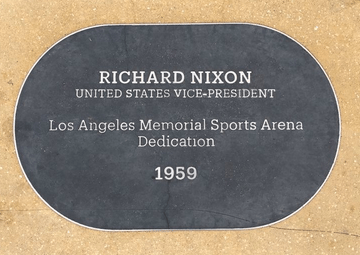 One more Nixonesque-sports connection can be found from something he did in 1959. On Exposition Park Drive just west of Figueroa Street, on the sidewalk along the north side of the current BMO soccer stadium, a plaque commemorates that day when, on July 4, 1959, then-Vice President Nixon dedicated the Los Angeles Sports Arena site as a memorial to U.S. Armed Forces Veterans. The arena stood until it was demolished in 2016.