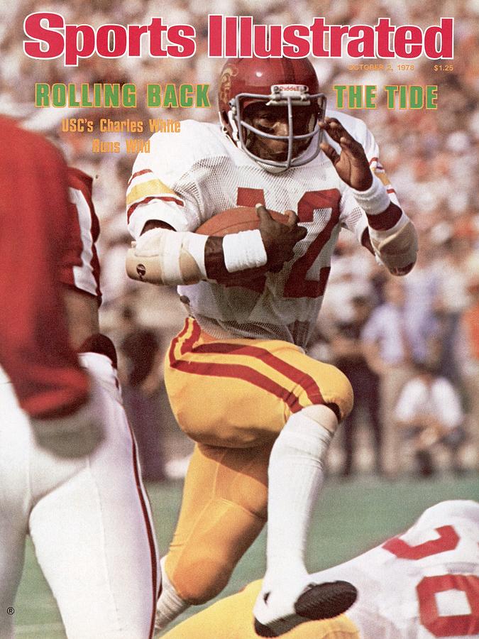 In high school, the state champion in the 330-yard hurdler ran for 1,118 yards and 14 touchdowns, averaging 9.4 yards a carry on the football field. He made an immediate impact as a true freshman at USC with 858 yards and 10 touchdowns backing up Ricky Bell. USC went 42-6-1 during his four years, winning the 1978 national title and four bowl games, three of them in the Rose Bowl. He was inducted into the USC Athletic Hall of Fame in 1995, the College Football Hall of Fame in 1996, and named to the Pac-12 All-Century Team in 2015. He also was a hurdler on USC’s 1979 track team. He capped his college career with one of the great performances in bowl history, rushing for 247 yards on 39 carries while battling the flu in a dramatic 17-16 victory over Ohio State in the Rose Bowl. His diving touchdown with 1:32 to play was the deciding score on a drive where he accounted for 70 of USC’s 80 yards. In ESPN’s 2020 list of the 150 greatest college football players in the game’s first 150 years, White is listed at No. 96 noting his 5,598 rushing yards; 6,545 all-purpose yards and 46 touchdowns. White died at age 64 in 2023 after a long battle with dementia and cancer, almost forgotten by the school.