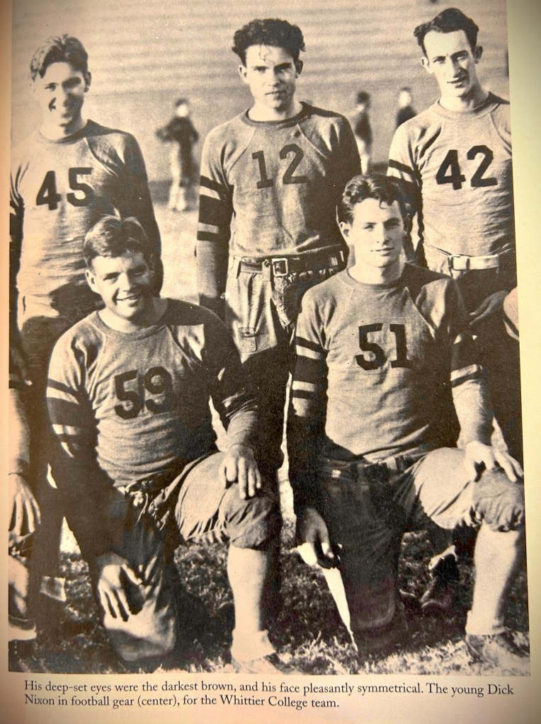 In the book, “The Rise of An American Politician,” Whittier teammate Wood Glover surmised that Nixon stayed on the football squad so long despite little play because “he just enjoyed the game. He enjoyed being around it. I think he liked the contact with those people. And I’m not too sure that he didn’t enjoy it most than he did with just the scholar type, because I think he was challenged from a different standpoint. You know, the athletes don’t give a hoot about what they say or when they say it … and I think Dick enjoyed the comradeship and the straightforwardness.”