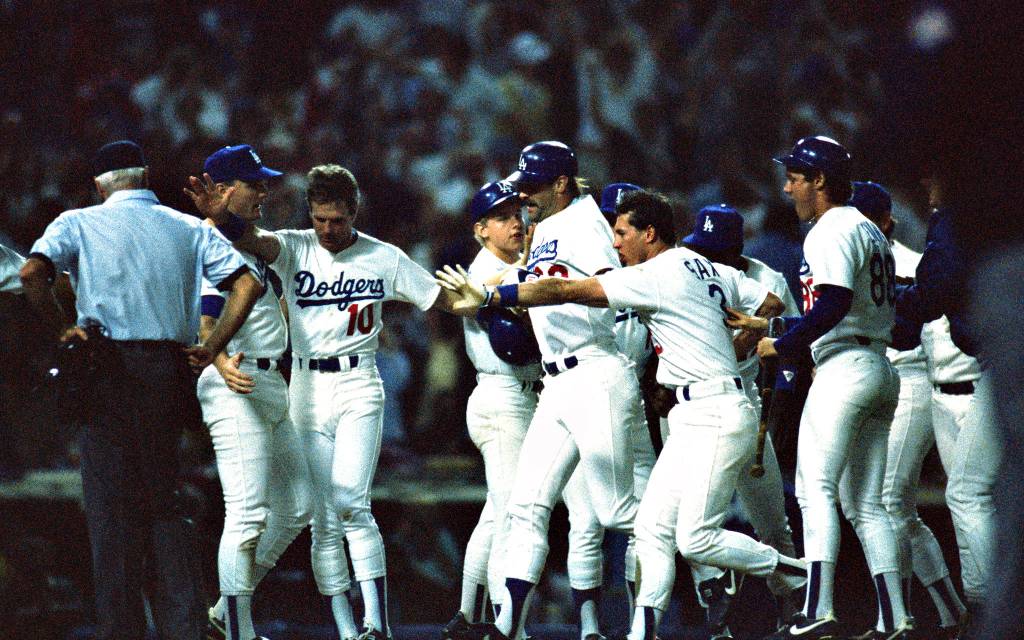 Making his way down the third base line, Gibson sees Mickey Hatcher holding out his hands to slap. More teammates are around him: Orel Hershiser, Tim Crews, Mike Sharperson, Rick Dempsey, pitching coach Ron Perranoski. Steve Sax is at home plate screaming. Tracy Woodson hugs Gibson from behind.