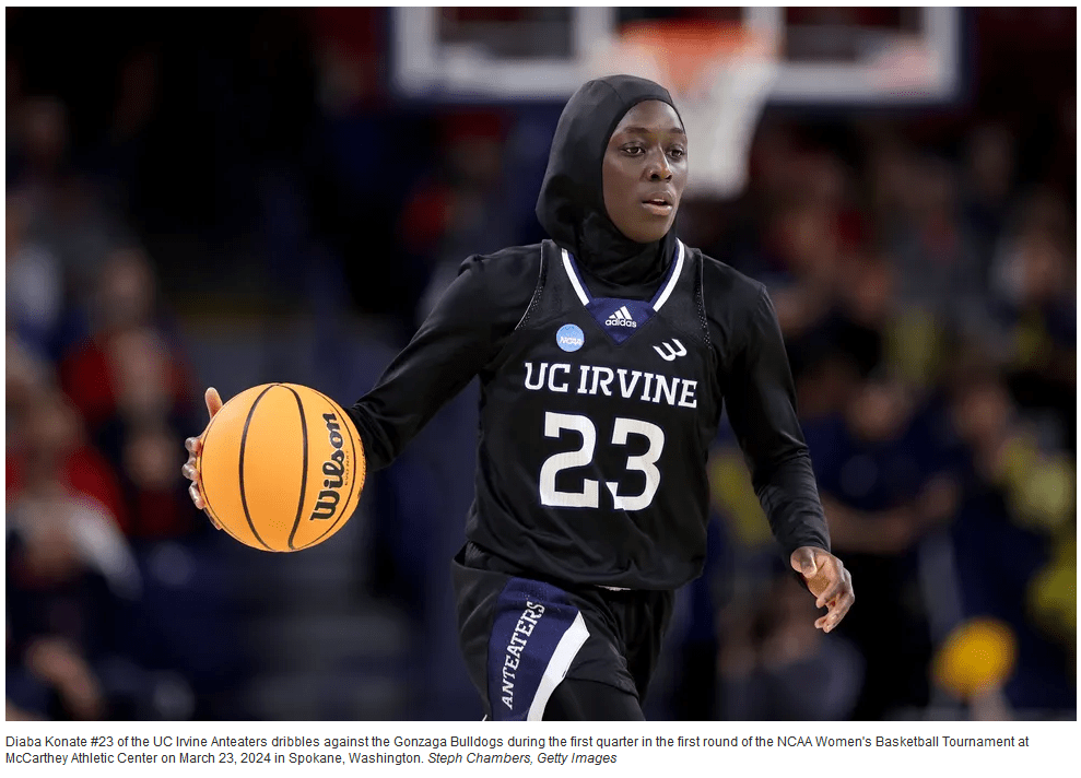The 5-foot-7 senior guard was named Big West Defensive Player of the Year, led the conference in assists, and was a two-time Big West All-Defensive Team selection. But she was not allowed to play for her native France during the 2024 Summer Olympics, in her hometown of Paris, because she’s a Muslim woman who wears a hijab while playing. A Muslim woman who chooses to cover her head in public, something she started doing in 2021 during the COVID-19 pandemic, said she realize how much comfort and love she felt when she leaned into her faith. “I just wanted to commit more,” she said, “and for me, it was by wearing the hijab.” In early 2022, the French Senate voted to ban hijabs in sports competitions, insisting that “neutrality” is a requirement and stipulating that wearing “conspicuous religious symbols is prohibited.” Konaté acknowledged her selection for France’s Olympic basketball team wasn’t a shoe-in. However, she pointed out that before the hijab ban came into effect she played for the French under-18 national team, with whom she won two silver medals and one gold. “I don’t know if I’m good enough, to be honest. I will never be able to answer that. I’ve never had the opportunity actually to be part of the team.”