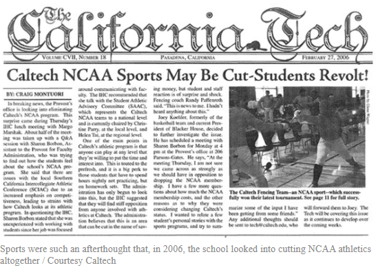 Caltech once considered dropping out of the SCIAC, where it was a founding member in 1915. For four years in the mid-1980s, it even dropped varsity basketball entirely. The students eventually wouldn’t allow it to be.