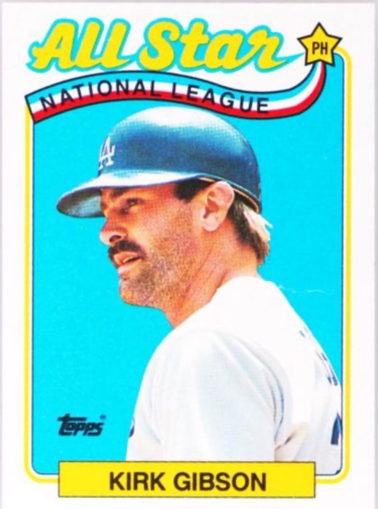One goofy thing about 1989: Topps baseball cards issued a set of those who made the previous year’s All-Star Team. Gibson was included. But he never was on that NL All Star team — or on any All Star team in his entire career. They decided to give him an “All Star” card and listed him as “PH.” Gibson had actually been invited to be on the 1985 AL All-Star team (a year after his famous 1984 season, which was his first as a regular player) and on the 1989 NL All-Star team (a year after his famous homer in ’88), but he declined both times.
