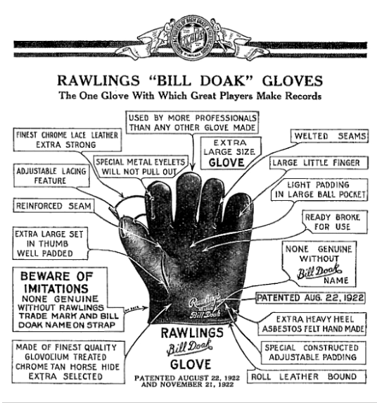 The Bill Doak model glove earned him as much as $25,000 in royalties in a year. It was still in the Rawlings line when Doak died in 1954.