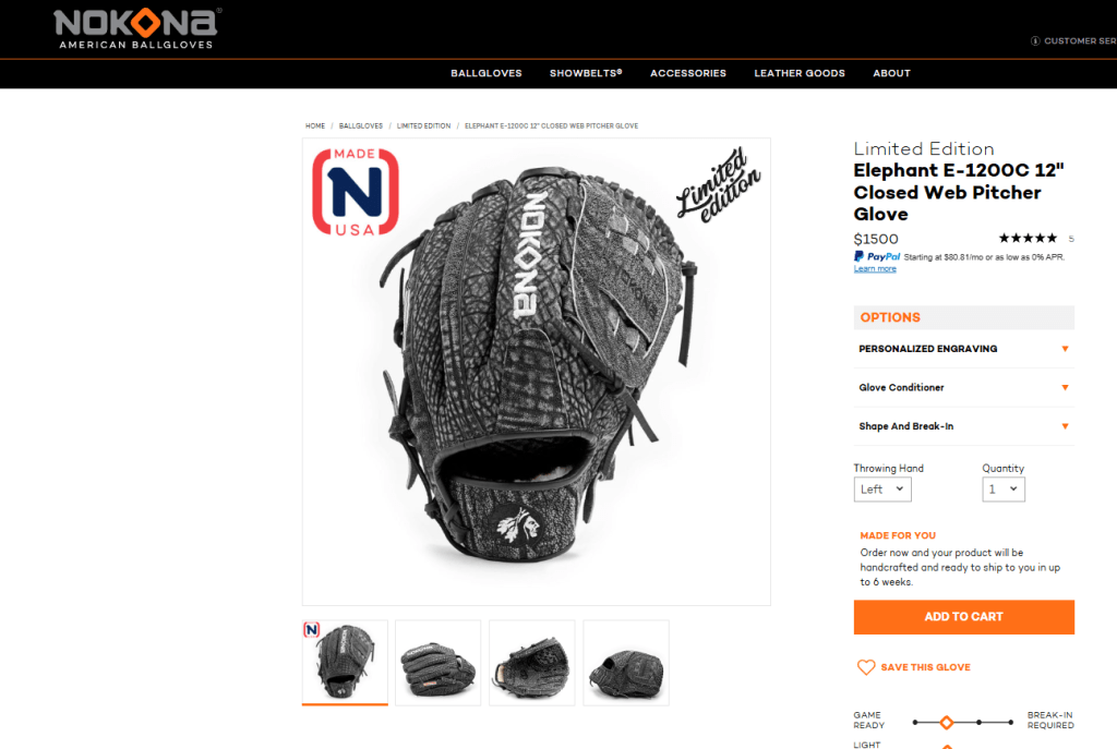 It also explains: “Elephant leather is one of the most durable materials used in our baseball gloves. Its dense fibers resist stretching and tearing, which allows the glove to maintain its structure season after season. Over time it breaks in beautifully, developing a unique patina while staying strong—making it a glove that can last for many years of play. Instead of Elephant leather wearing out, the glove gradually softens while maintaining its structural strength, giving it a broken-in feel without losing its shape.”