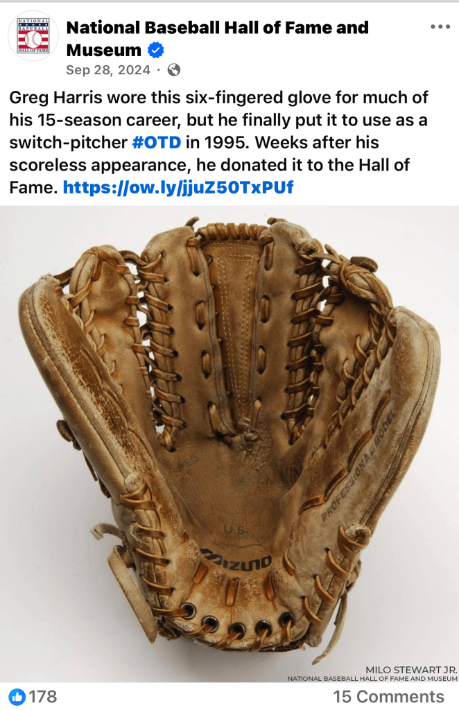 One of the joys we had during a visit to the Baseball Hall of Fame in Cooperstown was a journey to the basement room to go through some boxed-up memorabilia that otherwise hasn’t been out on display. One of them was a cool six-fingered glove worn by switch-pitcher Greg Harris, special made by Mizuno.