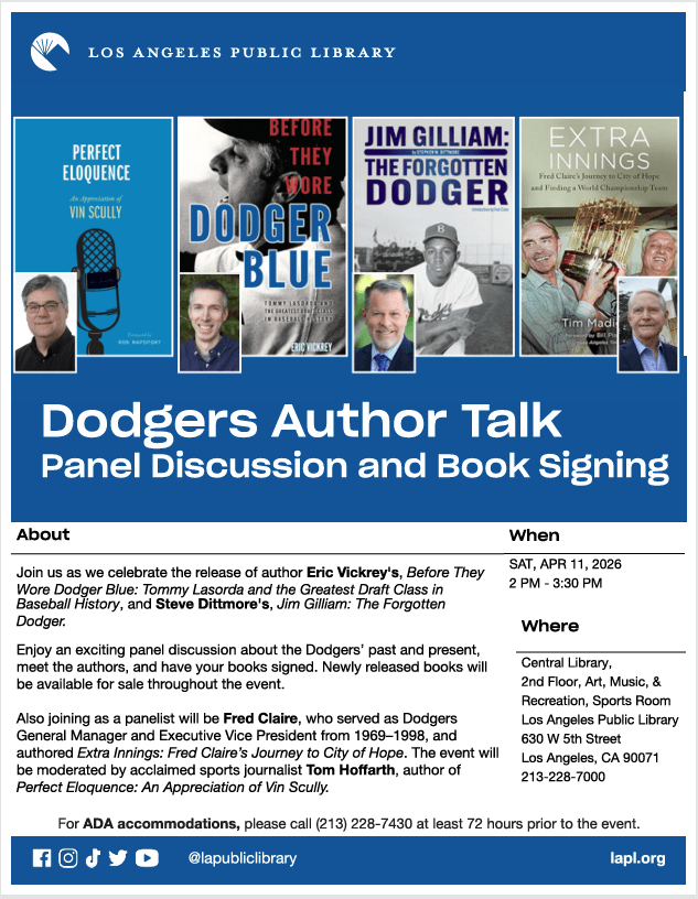 So here you go: A panel discussing that includes Vickrey and “Before They Wore Dodger Blue” — as well as former Dodgers general manager Fred Claire — is set for Saturday, April 11, from 2-to-3:30 p.m. at the Los Angeles Central Library. Vickrey and Steve Dittman (“Jim Gilliam: The Forgotten Dodger,” which we reviewed in 2024) are also guests on this Baseball Digest/August Publications podcast.
