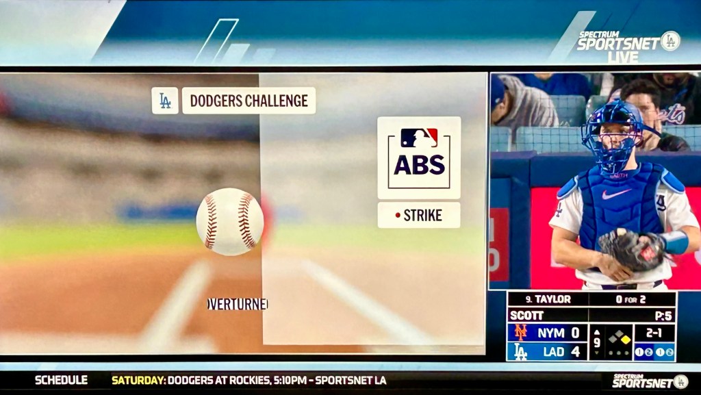 Now we’re being technologically challenged in the ninth inning with the Dodgers putting the final touches on a 4-0 victory. Gotta use those unused Automated Ball-Strike Challenge System head-taps, because they don’t carry over.
