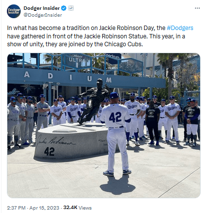 In 2017, when the Dodgers unveiled a statue honoring Robinson outside of Dodger Stadium, Vin Scully, as the master of ceremonies, told several stories about his relationship with Robinson, going back to Scully’s first year broadcasting Dodgers games in Brooklyn in 1950. Scully punctuated that speech with this “Jackie Robinson Day” celebration on April 15: