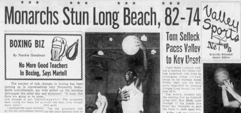 Six weeks later, in a Jan. 13, 1963 edition of the Van Nuys News and Valley Green Sheet, a story on Valley College’ 82-74 upset over Long Beach City College got Selleck into the headline. Valley ended a seven-game losing streak as Selleck was moved into the starting lineup and came up with 17 points to pace the Monarchs’ win. The team still finished 5-25.