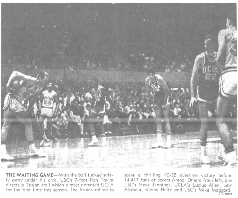 It almost worked. USC and UCLA were tied at 33 near the end of regulation when Bill Hewitt missed a 20-footer with three seconds left. In overtime, UCLA pulled away for a 40-35 win, as USC held Alcindor to 13 points.
