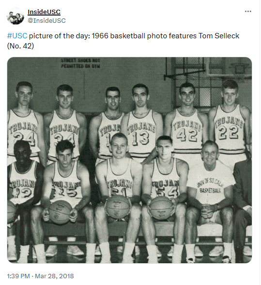 As a result, short story long, Selleck officially spent two years as a USC basketball player wearing No. 42 — it got him into 10 games, scoring a total of four points, as a means to an end. During that time, the last season USC had Forest Twogood as its head coach and the first year of Bob Boyd, two good things happened for Selleck embracing his jock/frat boy status.
