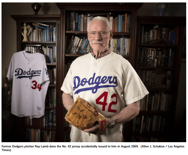 Call him the Sacrificial Lamb. Born in Glendale and a 40th-round pick by the Dodgers out of USC, the right-handed swing-man pitcher has the odd distinction of wearing two numbers in his only two seasons with Los Angeles that the franchise would eventually retire for someone else. As a 24-year-old rookie called up in August of 1969, appearing in just 10 games, Lamb was given No. 42 — which he wore with the Trojans. The team realized it needed to take it out of circulation for Jackie Robinson to honor him in the coming years. As a result, Lamb’s second season (when he posted a 6-1 mark in 35 games) saw him wear No. 34 — to be eventually hung up for Fernando Valenzuela.