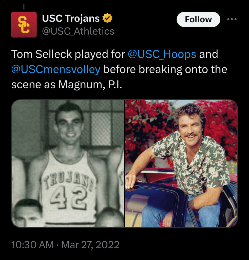 Somehow, some confused that Selleck played volleyball at USC. In Sports Illustrated, Selleck was called a “former Trojan spiker” watching his step son, middle blocker Kevin Shepard, compete for USC in the 1990 NCAA volleyball finals when the Trojans upset Long Beach State. The truth is, USC didn’t start its men’s volleyball program until 1970 after Selleck left.