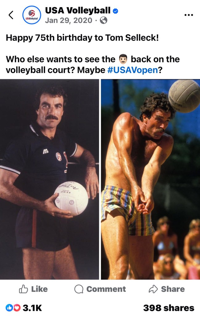 At the height of that fame, Selleck somehow became the honorary captain of the U.S. men’s Summer Olympics volleyball team at the Los Angeles Games in 1984. He would sign posters of him in uniform to sell for fundraising.