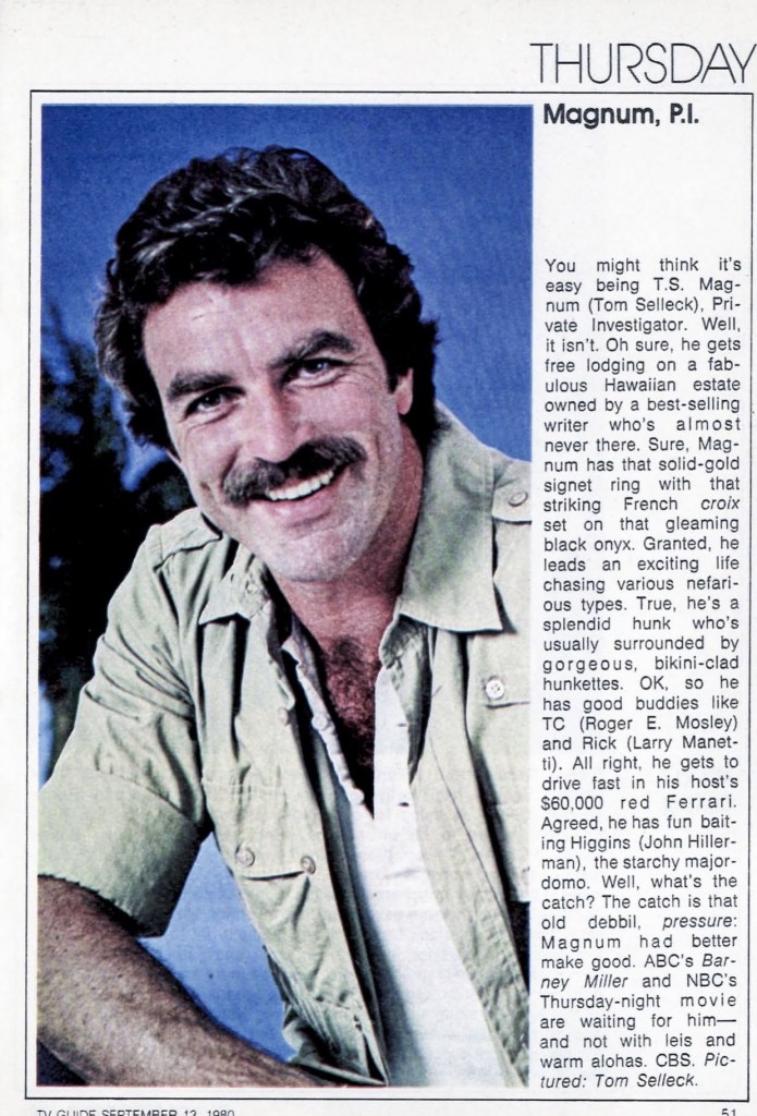 Then came the pilot for the TV series “Magnum, P.I.” Selleck played a Vietnam vet and former Navy SEAL who relocates to Hawaii and becomes a private investigator. For 158 episodes, from 1980 to 1988, Selleck became Magnum, complete with his hometown Detroit Tigers’ cap.