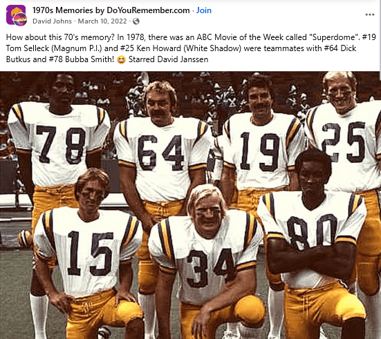 The athlete/actor combo worked for him in the 1978 ABC “Movie of the Week” drama “Superdome,” which used the Super Bowl then in New Orleans as the backdrop. NFL player such as Dick Butkus, Bubba Smith and Les Josephson were part of the cast as Selleck played Cougars quarterback Jim McCauley, wearing No. 19.