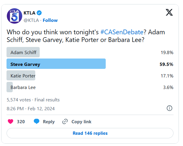 The twist in all this — the California primaries reward the top two vote-getters regardless of party moved onto the Nov. 5 general election. In this wrestling match to finally get the seat once held by Diane Feinstein, Democratic candidate Adam Schiff was an early favorite but he created a campaign strategy targeting Garvey as his main competitor — inciting more Republican support for Garvey — because Democrat Katie Porter provided a far-more serious threat to Schiff.