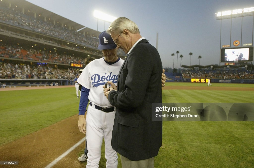 Roy Gleason looks at a replacement of the 1963 World Champion ring he was given by the Los Angeles Dodgers during a ceremony at Dodger Stadium, with manager Jim Tracy, before a game on Sept. 20, 2003. Gleason’s career was cut short by the Vietnam War, where Gleason received a Purple Heart and other decorations but never returned to baseball. The original ring was lost in Vietnam. (Photo by Stephen Dunn/Getty Images)