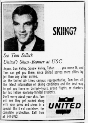 As a way to draw some income at the time, Selleck worked for United Airlines as a USC campus rep. If you saw this ad in the Daily Trojan with his handsome mug, wouldn’t you give him a call at 747-3922 and see if he could “get your piles and shoes in a special United container for complete protection” as you jetted off to Squaw Valley — a place you can’t call Squaw Valley any more and is known as Palisades Tahoe?