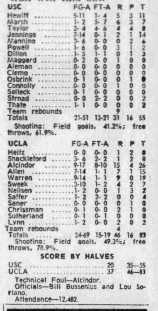 (When the two teams played the final conference game on Saturday, March 11, again at Pauley Pavilion, Boyd did some stalling again, but eventually called it off, and the Trojans lost again by nearly 30 points, 83-55. Alcindor scored 26 (and also had a technical foul). Selleck’s final appearance as a Trojan was long enough for him to take one last shot. He was one of 15 USC players who got in).